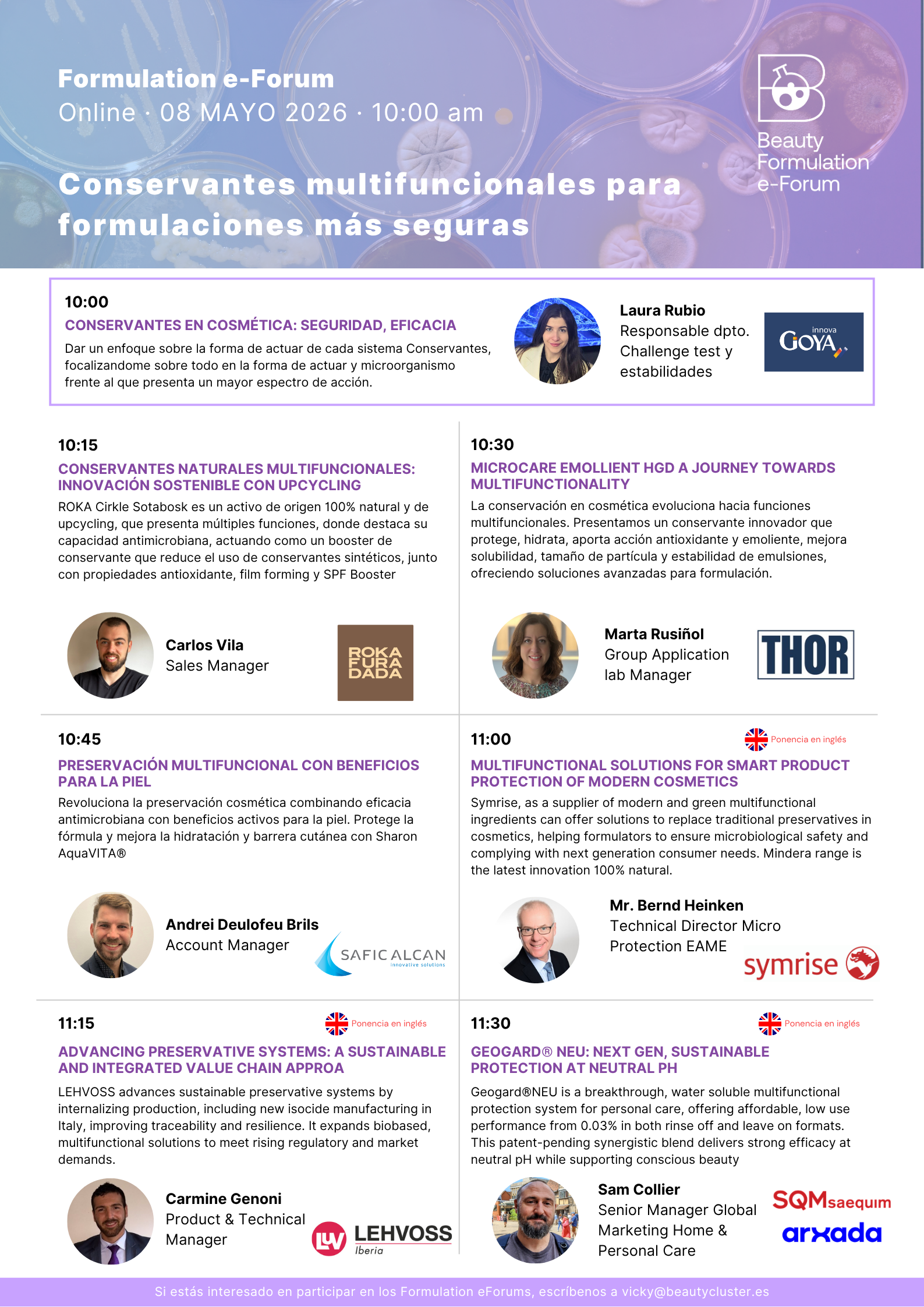 En este seminario se revisará el papel de los conservantes en la cosmética actual, las nuevas materias primas disponibles y las estrategias de aplicación para lograr formulaciones seguras, estables y atractivas.